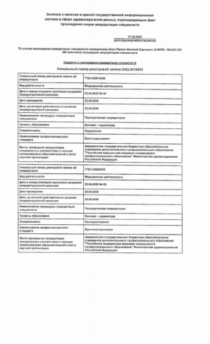 В 2017 году ординатру в Российской медицинской академии последипломного образования (РМАПО), квалификация "врач - колопроктолог".