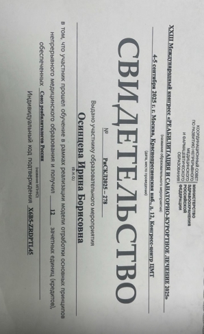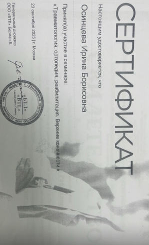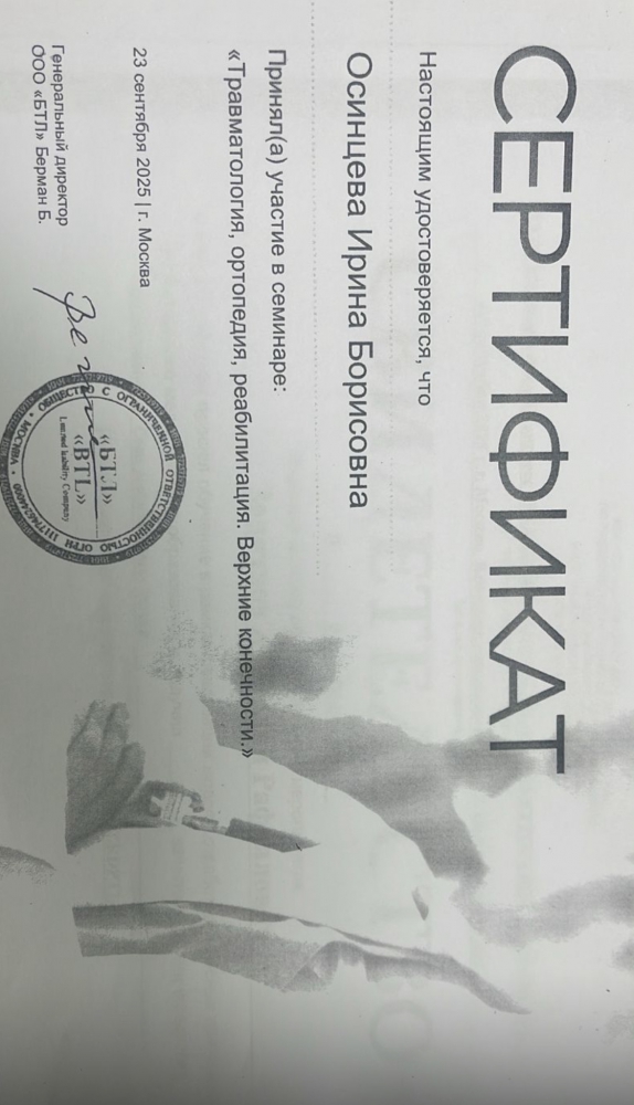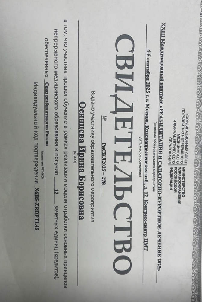 Врач - физиотерапевт. Имеет действующий сертификат специалиста по специальности "Физиотерапия".