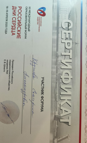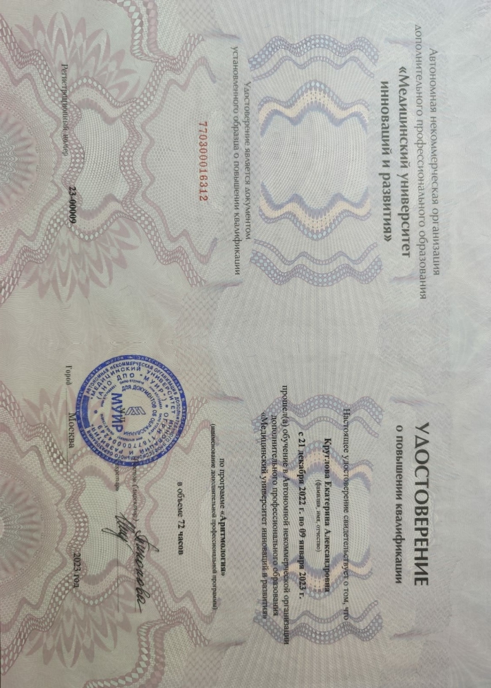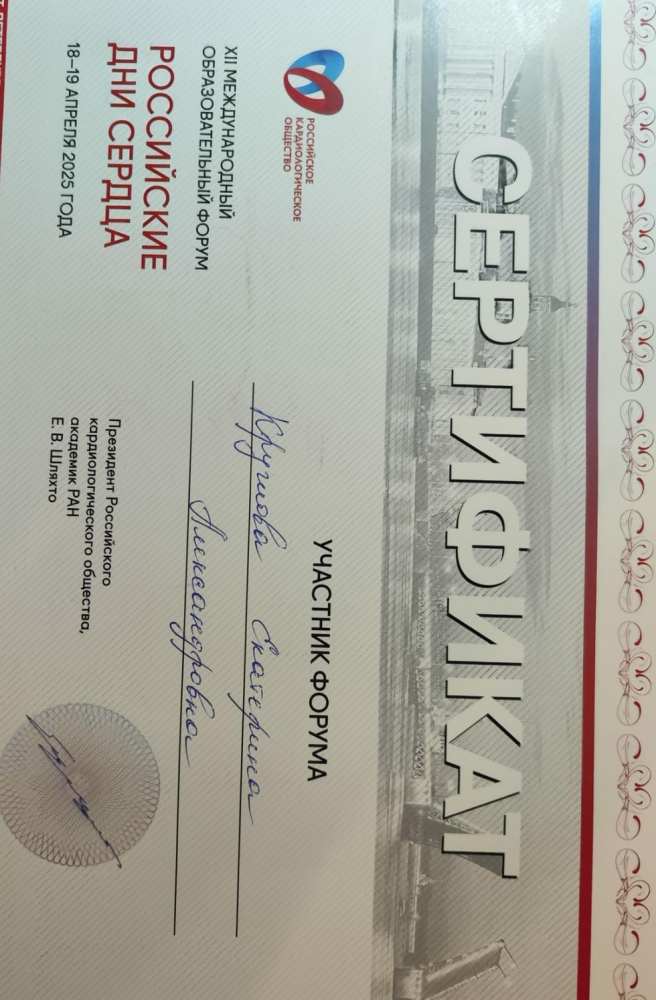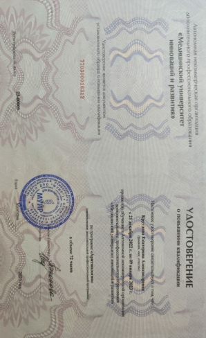 2023 г. – повышение квалификации по программе «Аритмология» ДПО «Медицинский университет инноваций и развития».