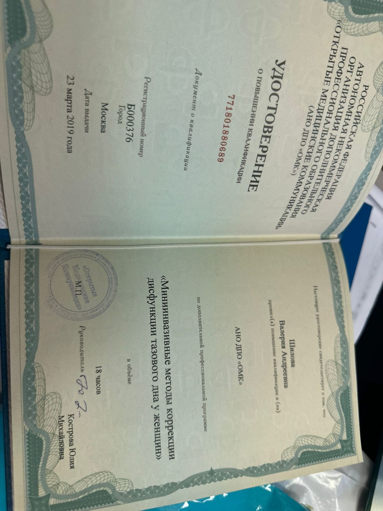 В 2019 году – повышение квалификации по дополнительным профессиональным программам «Диагностическая и оперативная гистероскопия» и «Миниинвазивные методы коррекции дисфункции тазового дна у женщин».