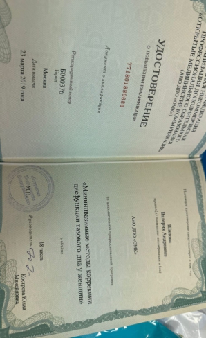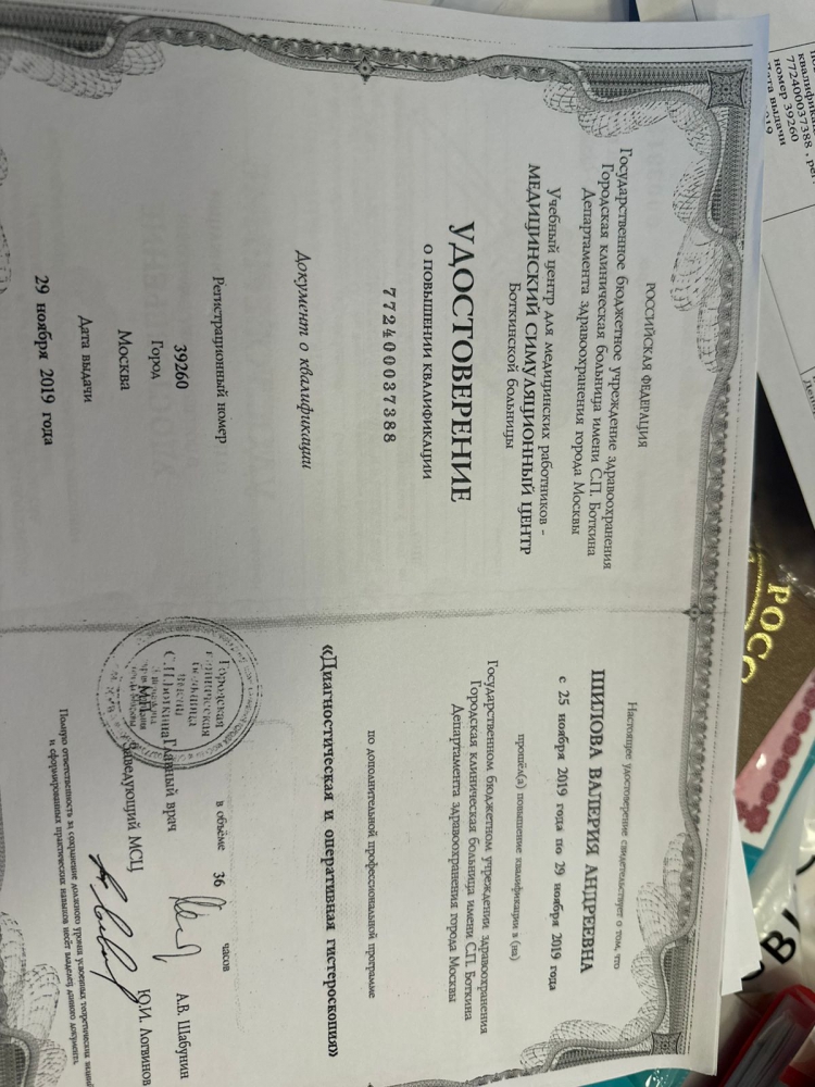 Имеет действующие сертификаты по направлениям «Акушерство и гинекология», «Ультразвуковая диагностика».ООО "Эндохирургический Центр"