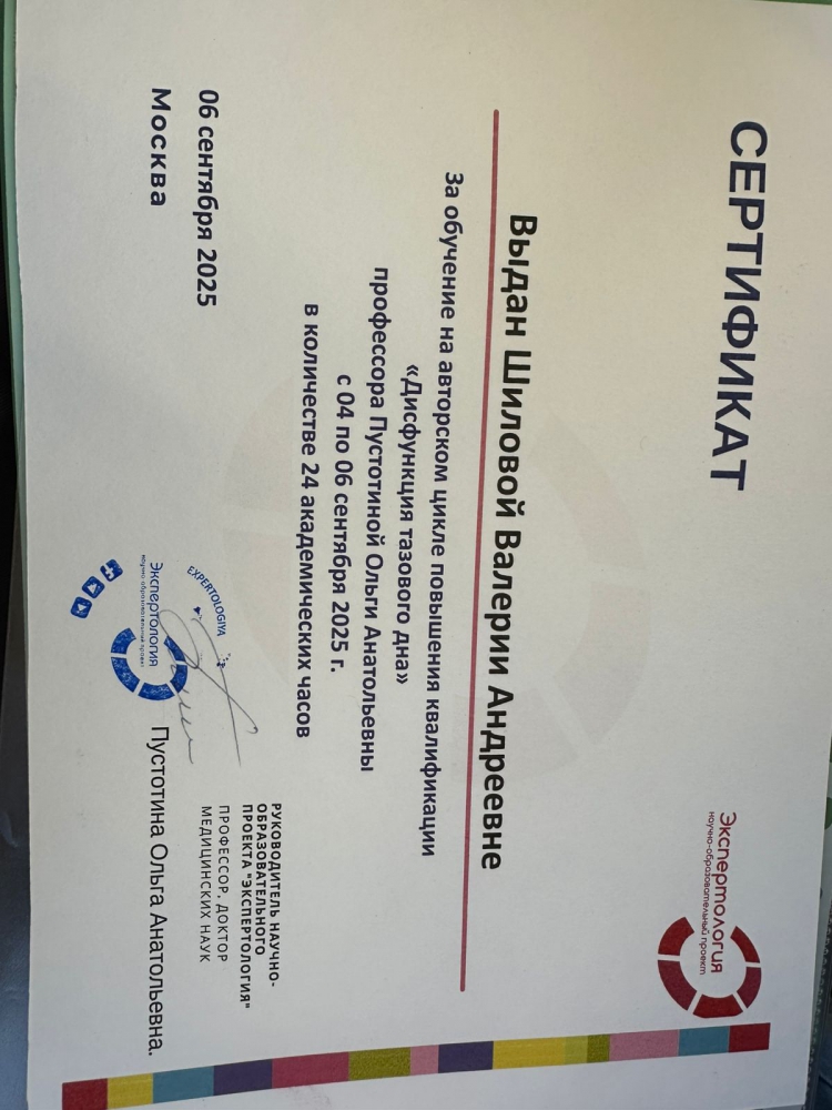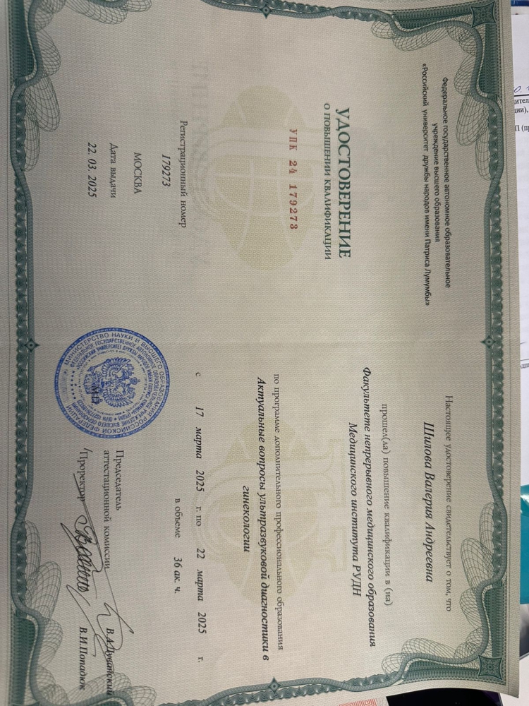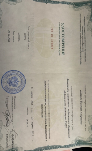 В 2025 году - повышение квалификации в Российском университете дружбы народов имени Патриса Лумумбы по программе дополнительного профессионального образования "Актуальные вопросы ультразвуковой диагностики в гинекологии".