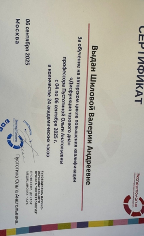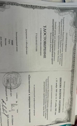 В 2024 году - повышение квалификации в ООО "Научно - производственная фирма "Фотек" в г. Екатеринбурге по дополнительной профессиональной программе "Диагностика и лечение патологии шейки матки, влагалища и вульвы: практические аспекты".
