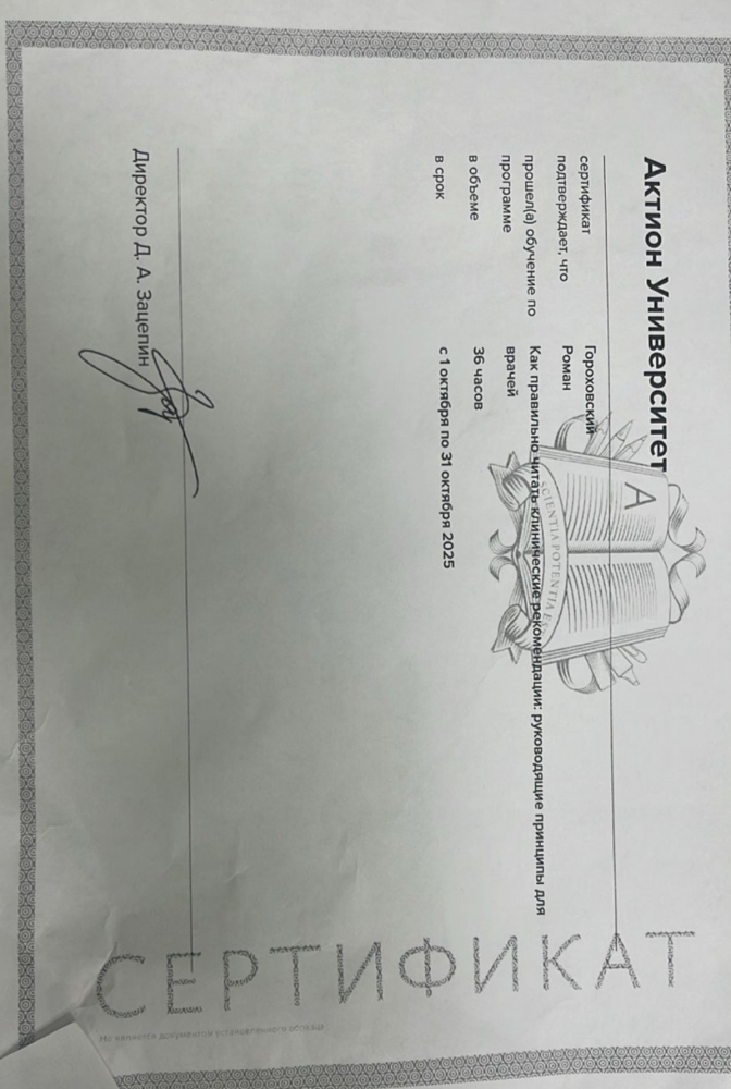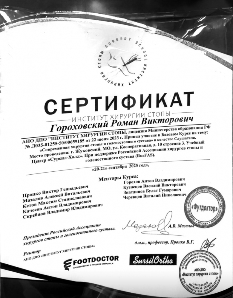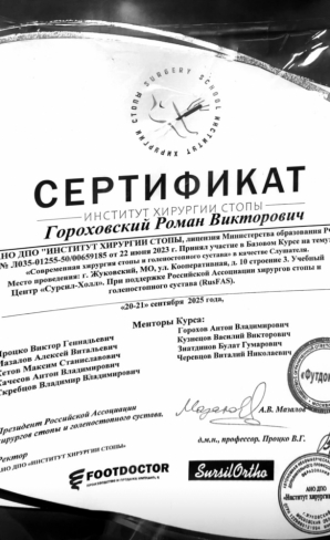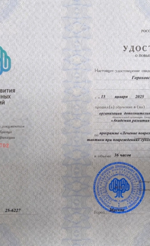 Имеет действующий сертификат специалиста по направлению «Травматология и ортопедия».