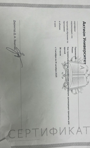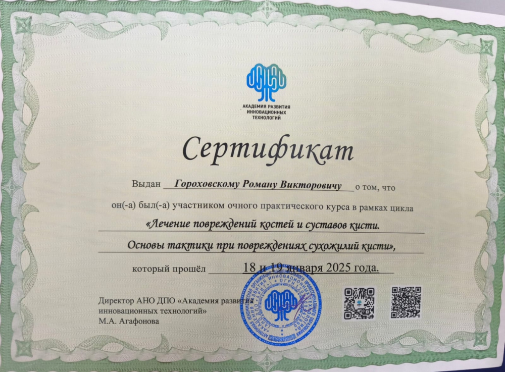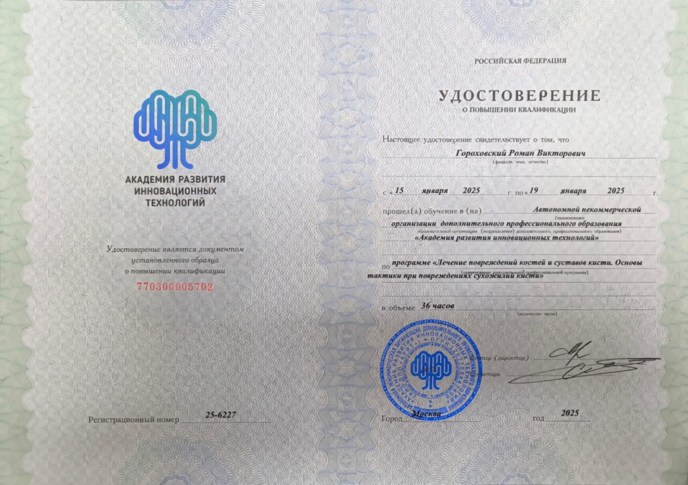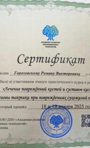 2025 г. - участник практического курса «Лечение повреждения костей и суставов кисти. Основы тактики при повреждениях сухожилий кисти» АРИТ. Г. Москва