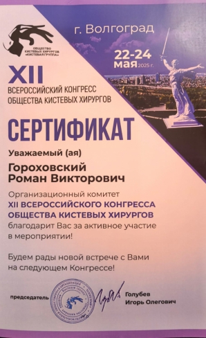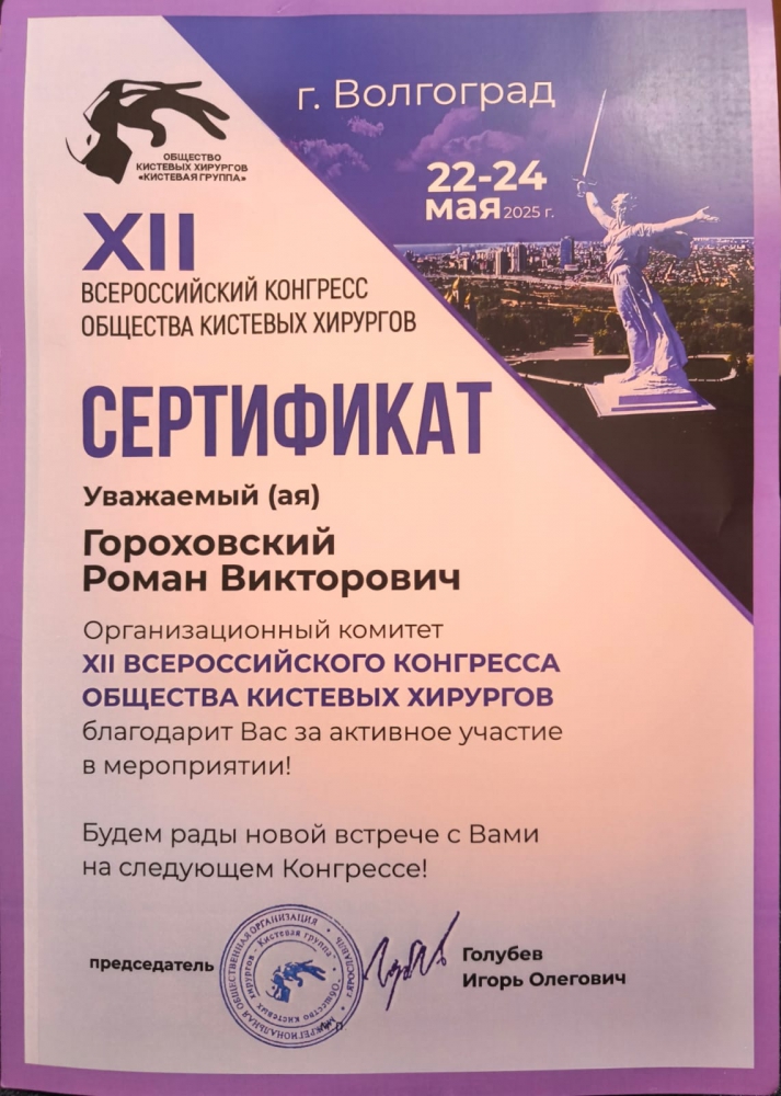 2025 – участник ХII «Всероссийского конгресса общества кистевых хирургов» г. Волгоград