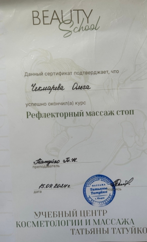 В 2024 году – повышение квалификации по направлению «Подология». Практический курс, стажировка по теме: «Техника выполнения аппаратного педикюра».