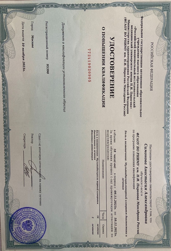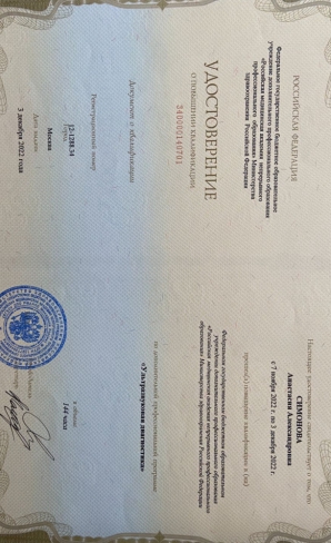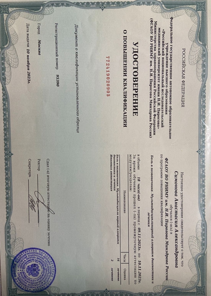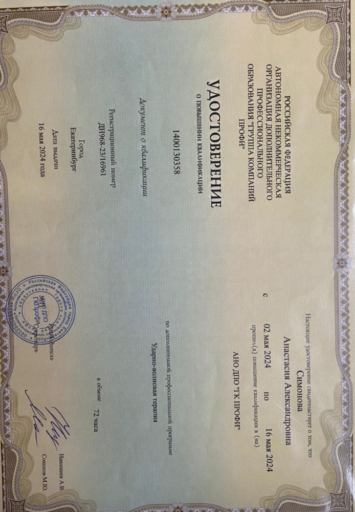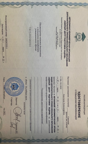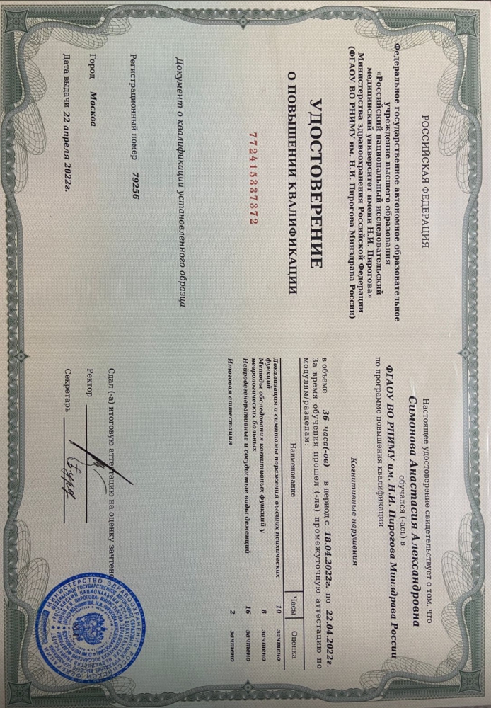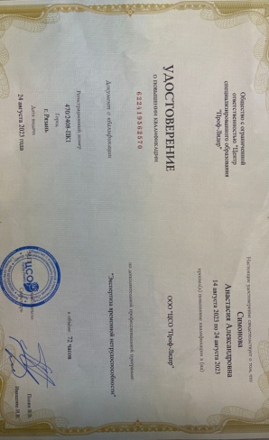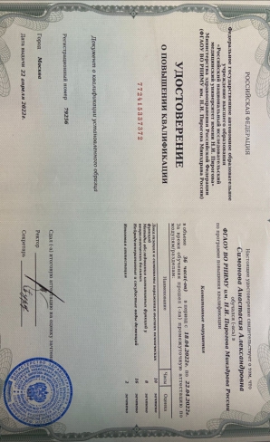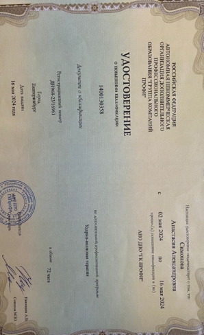 2022 г.- Профессиональная переподготовка по специальности «Физическая и реабилитационная медицина» в ООО «Институт развития профессиональных компетенций» в г. Челябинске.