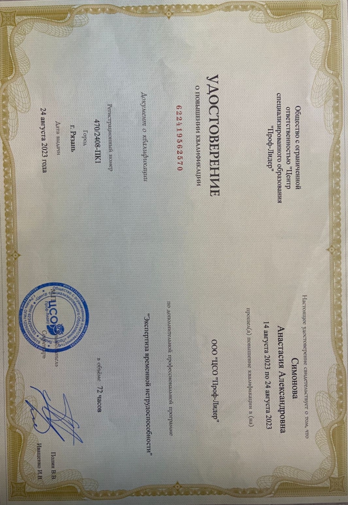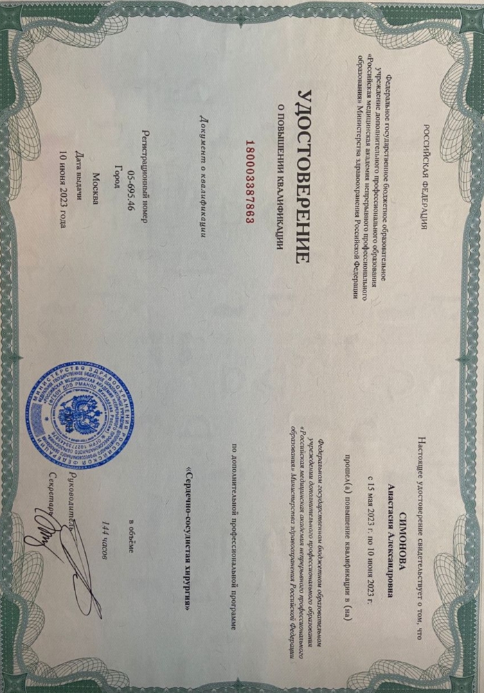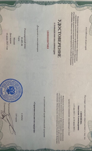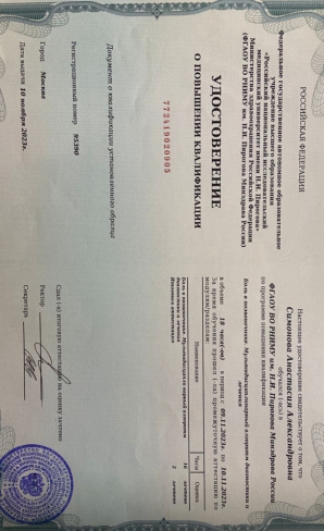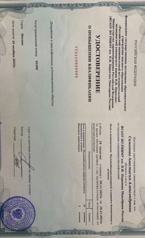 2019 г. - Профессиональная переподготовка по специальности «Организация здравоохранения и общественное здоровье» в Институте государственного и корпоративного управления РФ в г.Москве.