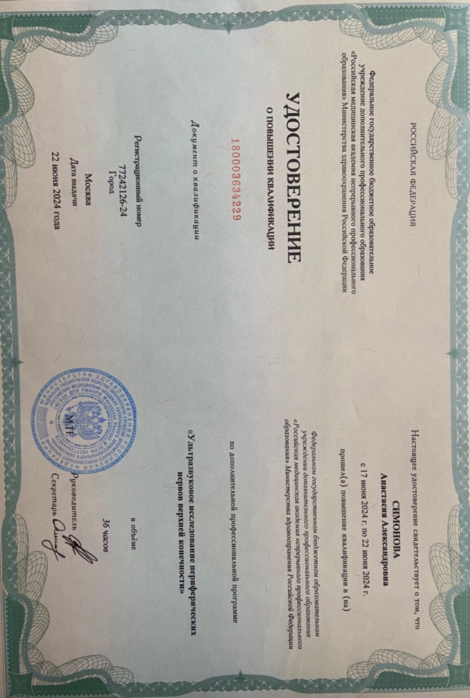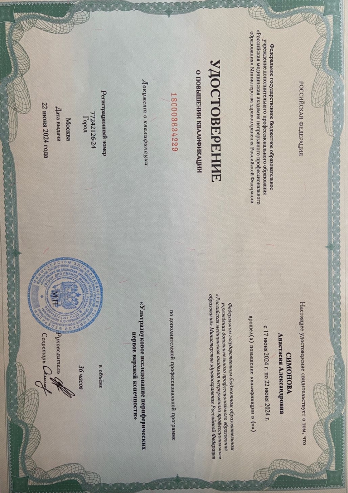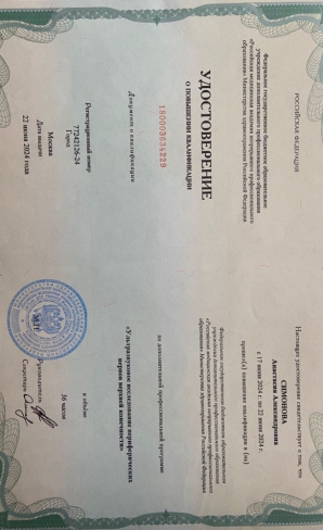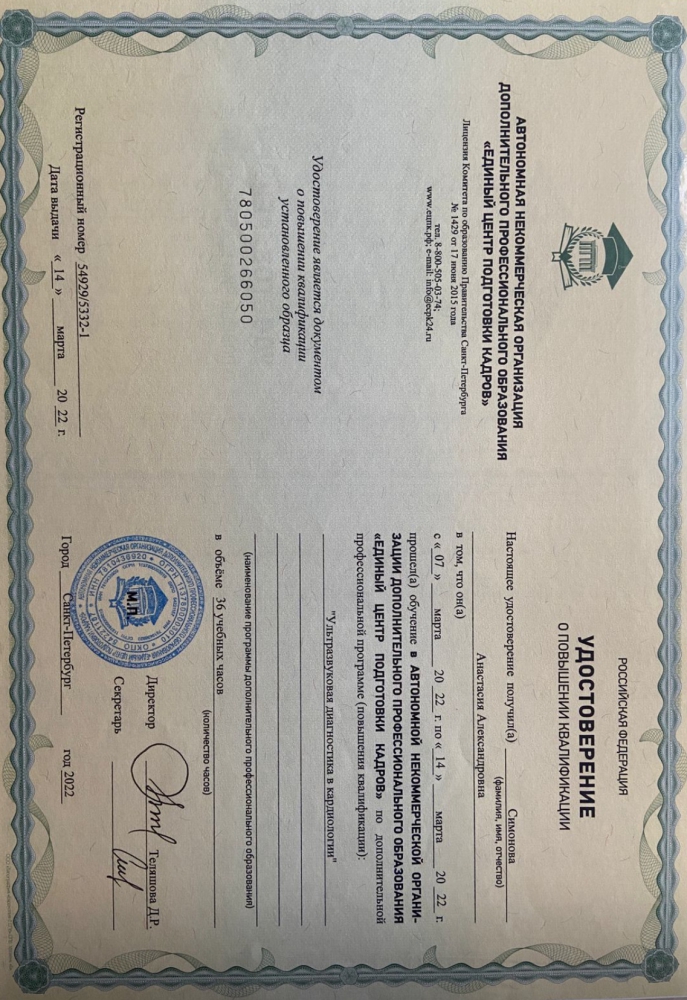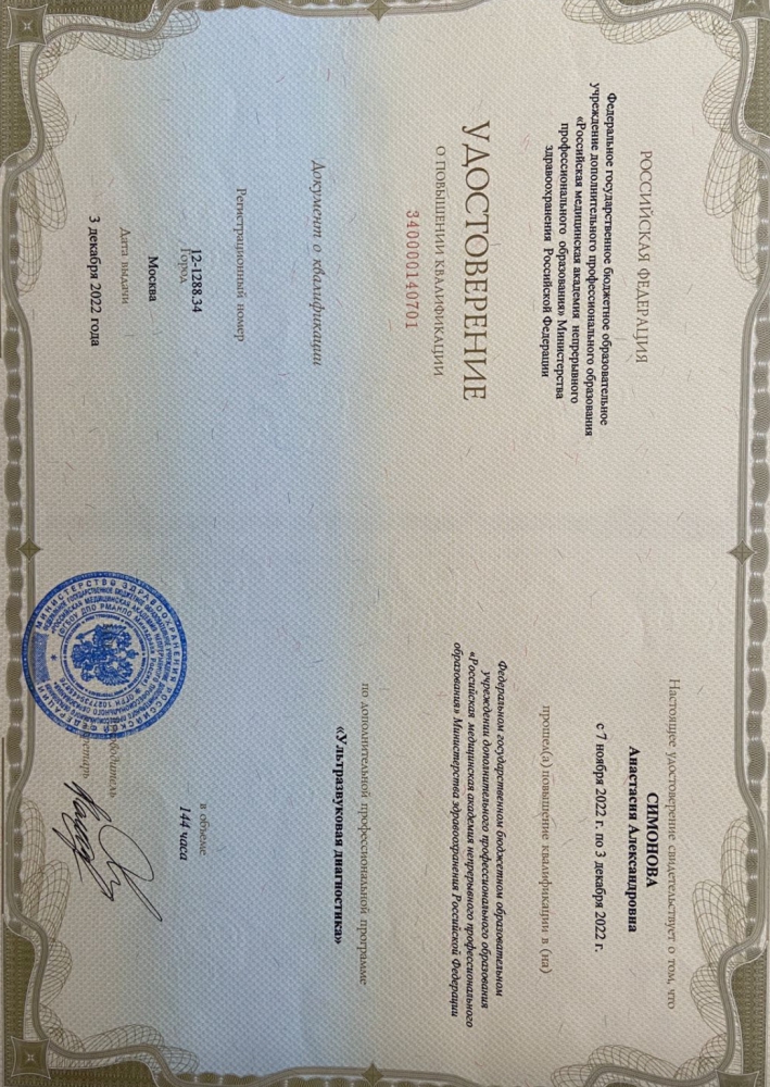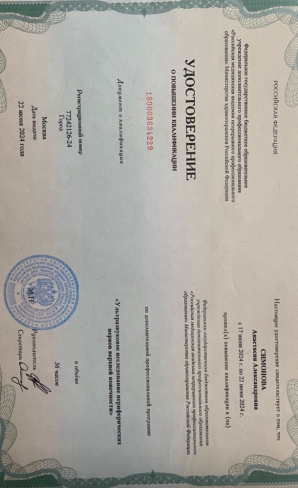 2014 г. - Профессиональная переподготовка по специальности «Ультразвуковая диагностика» в ГОУ ВПО Тверская ГМА.
