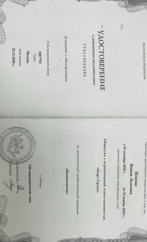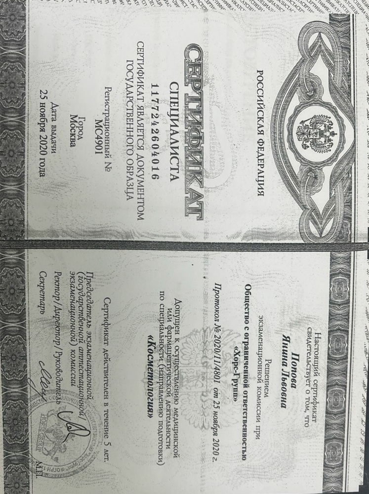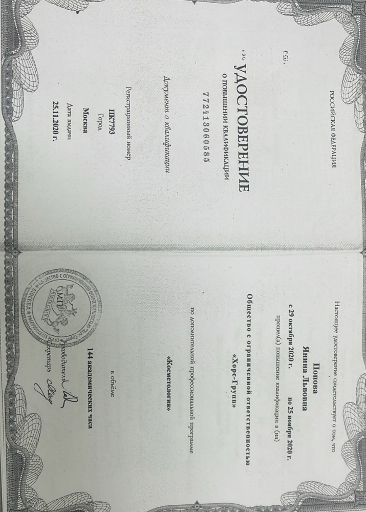 В ноябре 2020 и октябре 2021 года прошла обучение от Академии Asclepion на эрбиевом лазере MCL31 Dermablate.