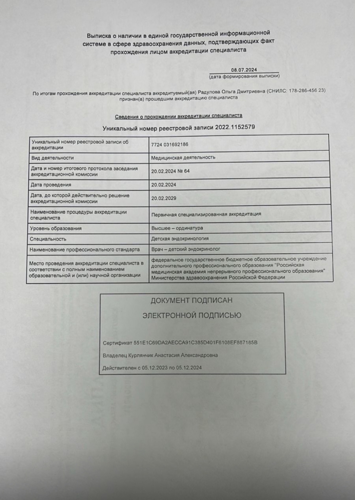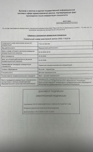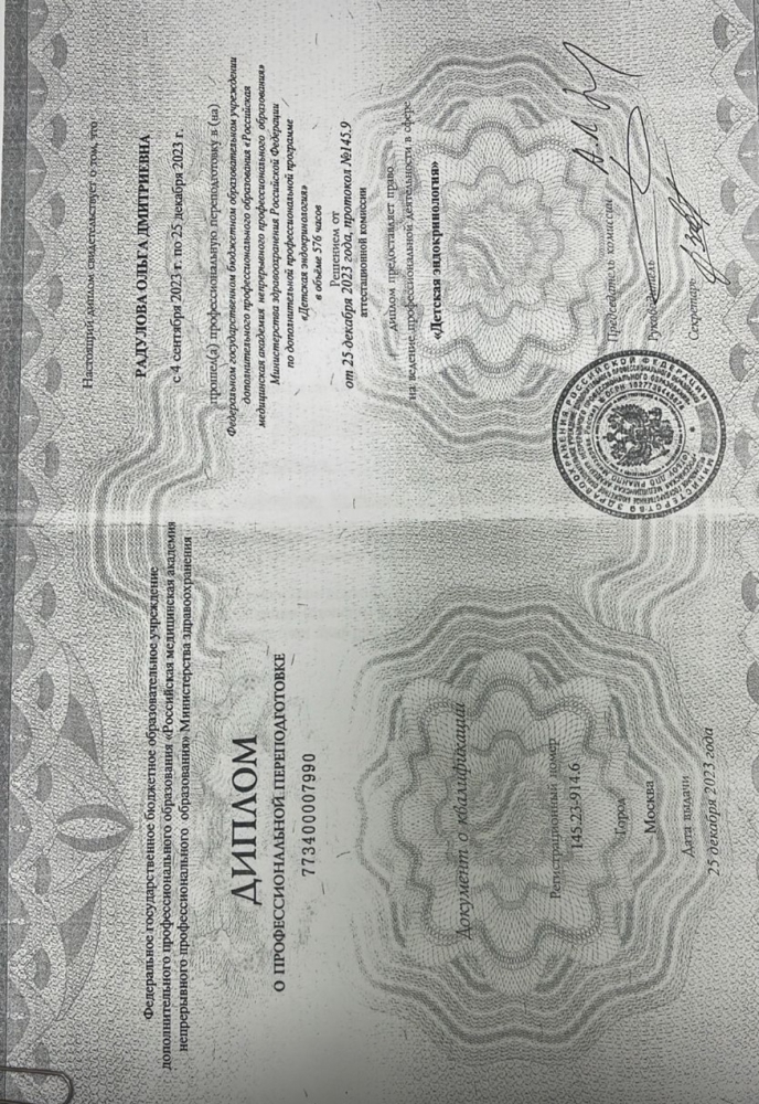 Имеет действующие сертификаты по направлениям «Педиатрия» и «Детская эндокринология».