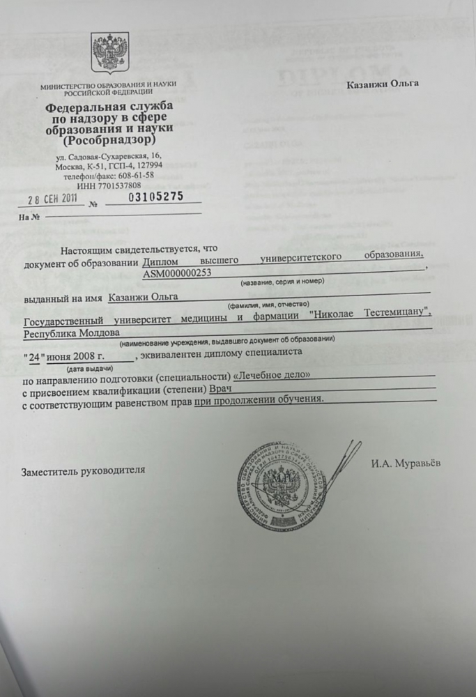 В 2011 году там же успешно завершила обучение в ординатуре по специальности «Педиатрия».