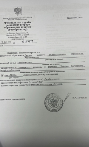 В 2008 году окончила Кишиневский государственный университет медицины и фармации им. Николая Тестемицану, 2002-2008 гг. по специальности «Лечебное дело».