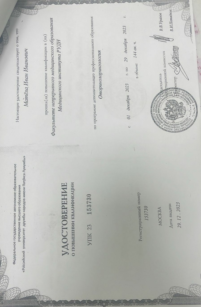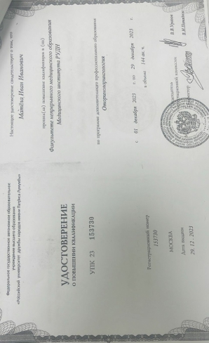 В 2023 году прошел повышение квалификации по программе «Оториноларингология» в Российском Университете Дружбы Народов.