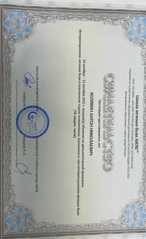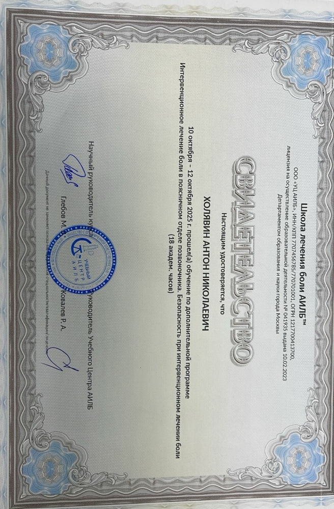 В 2025 году прошел повышение квалификации в ООО "Учебный центр АИЛБ" г. Москва по дополнительной профессиональной программе "Интервенционное лечение боли в поясничном отделе позвоночника. Безопасность при интервенционном лечении боли."ООО "Эндохирургический Центр"