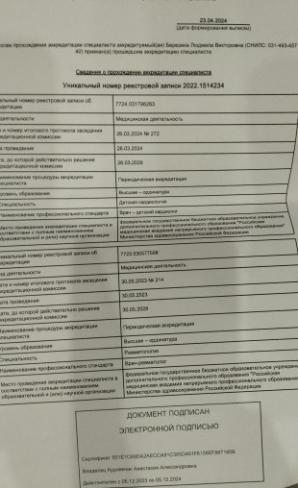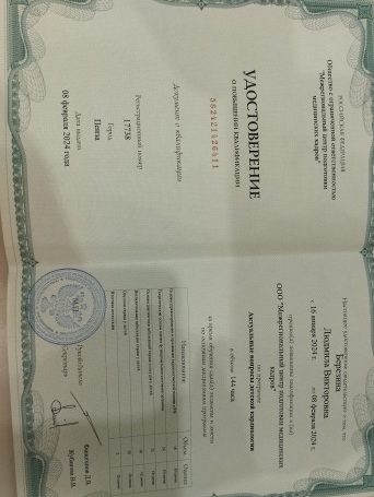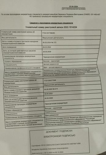 Имею высшую квалификационную категорию по детской кардиологии и вторую квалификационную категорию по ревматологии.